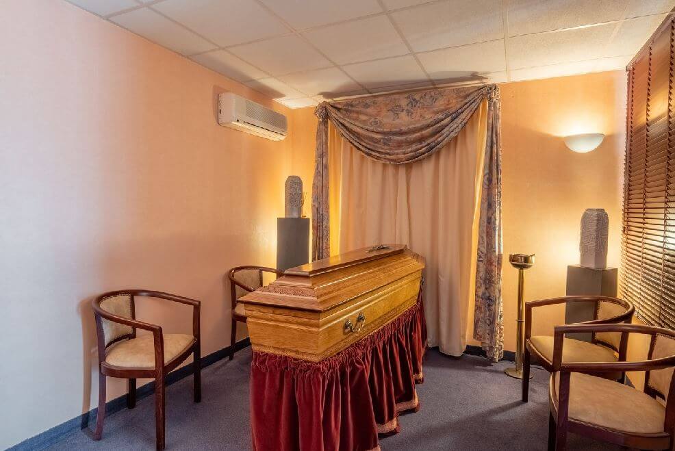 Les personnes sont reçues dans un salon d’accueil, plus ou moins équipé pour recevoir les endeuillés (souvent sont proposés quelques services comme la mise à disposition de boissons).